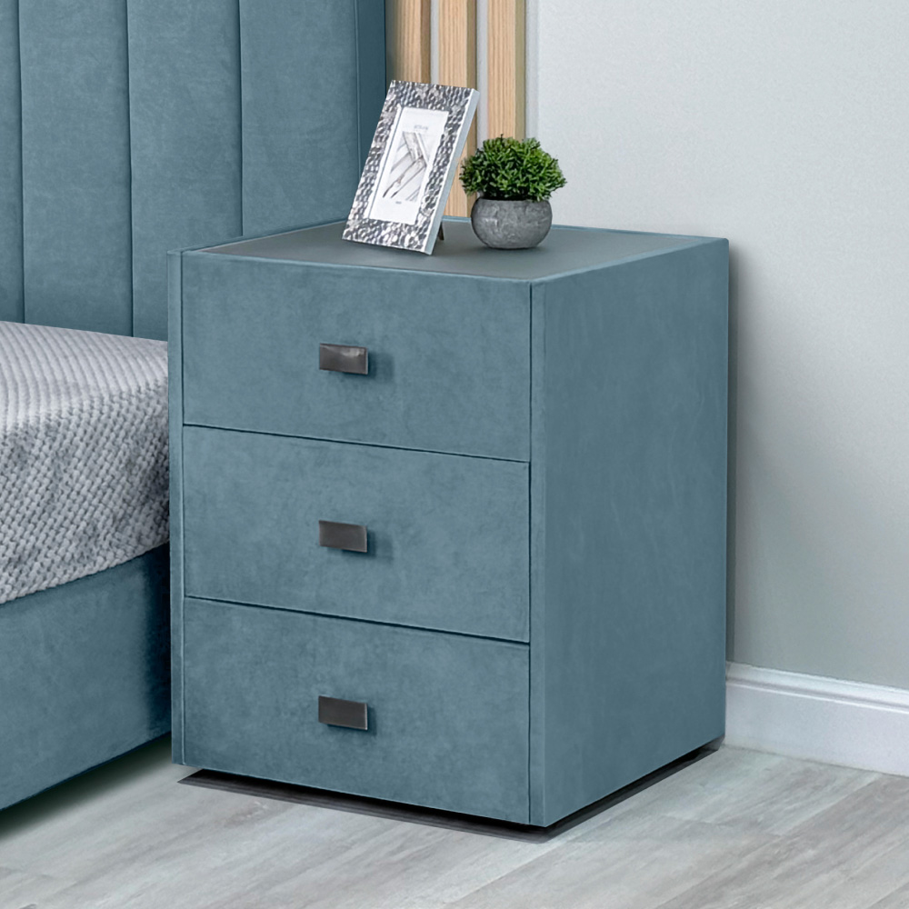 Прикроватная тумба в мягкой обивке дополнит и украсит интерьер любой спальни. Универсальная модель с тремя ящиками станет удобным и практичным дополнением к кровати. Крышка тумбы комплектуется стеклом, которое защищает тканевую поверхность от загрязнений и облегчает ее уход.